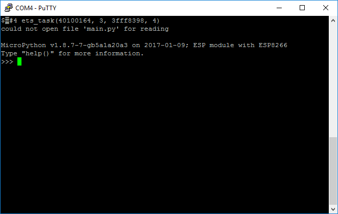 We’ll want to select our serial port again, in my case it is COM4 and set the speed, or baud rate, to 115200. Then we can open the connection and we should be prompted with a Python read-evaluate-print-loop (REPL) interface as shown: